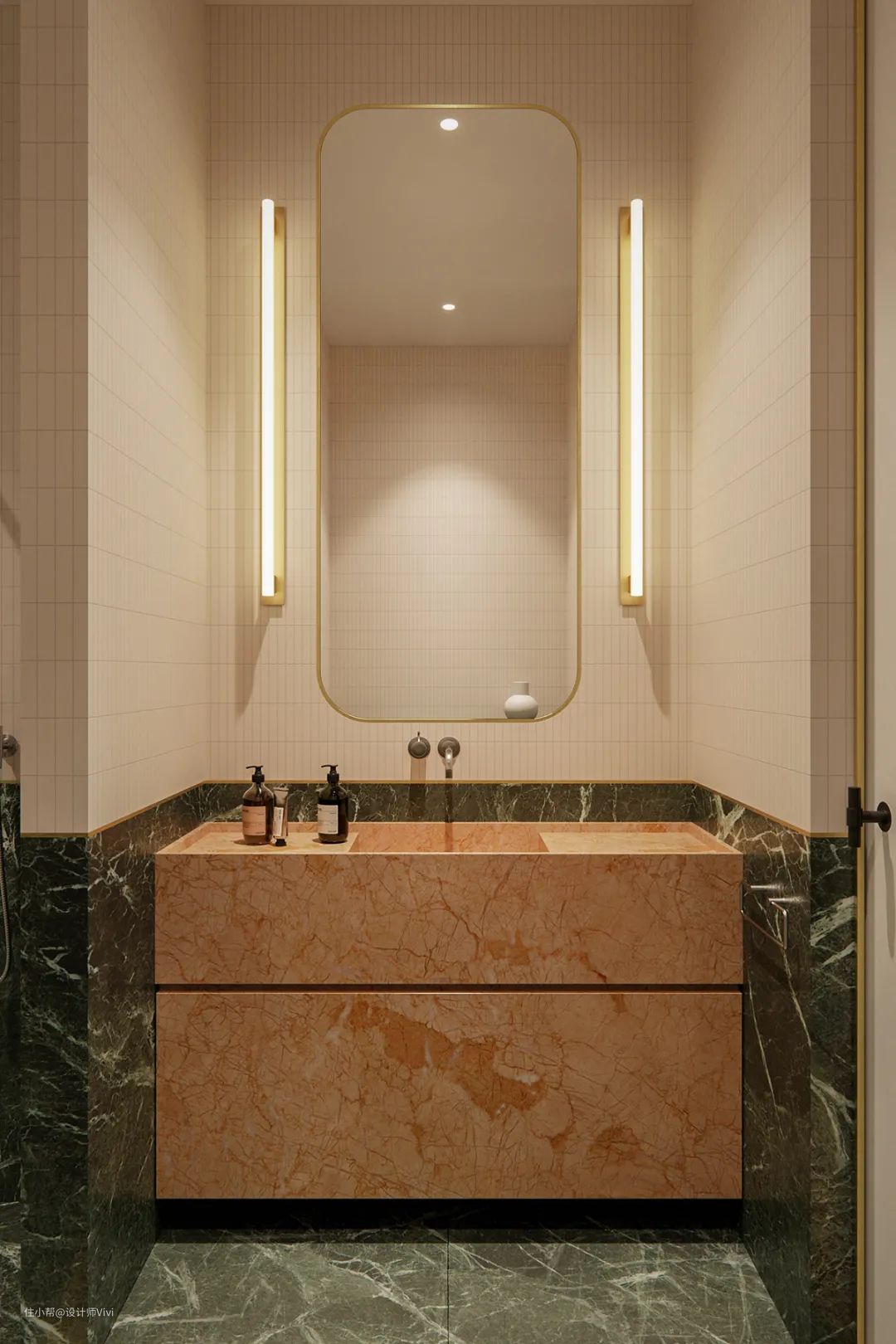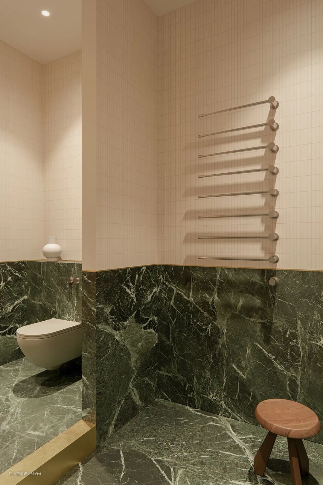 浴室设置在最里面,不仅是大理石浴缸和绿色的置物台别致,圆形壁灯也相当美观,它提供照明的同时,也是一个美丽的艺术装饰,无不抓住人们的眼球。