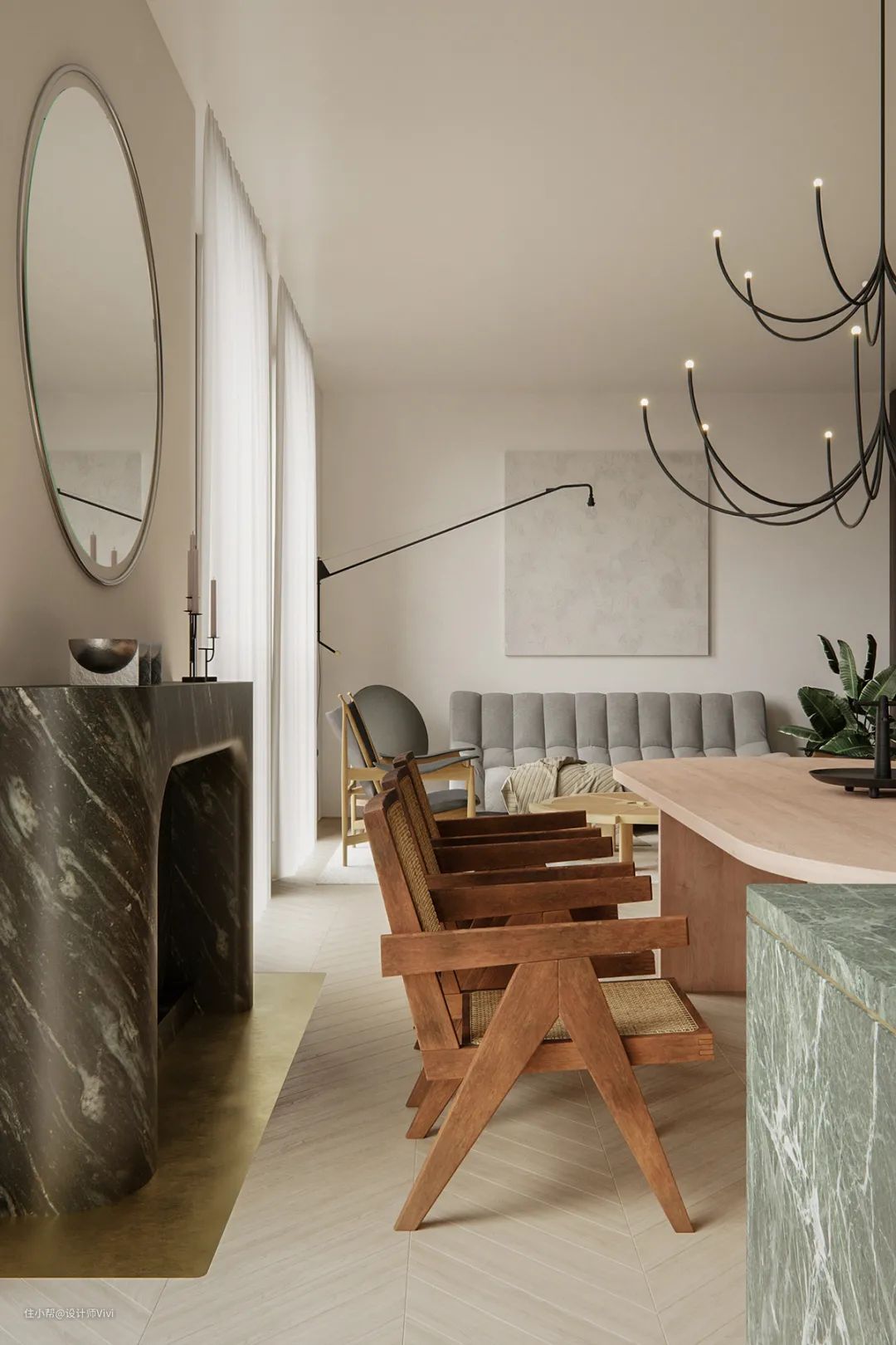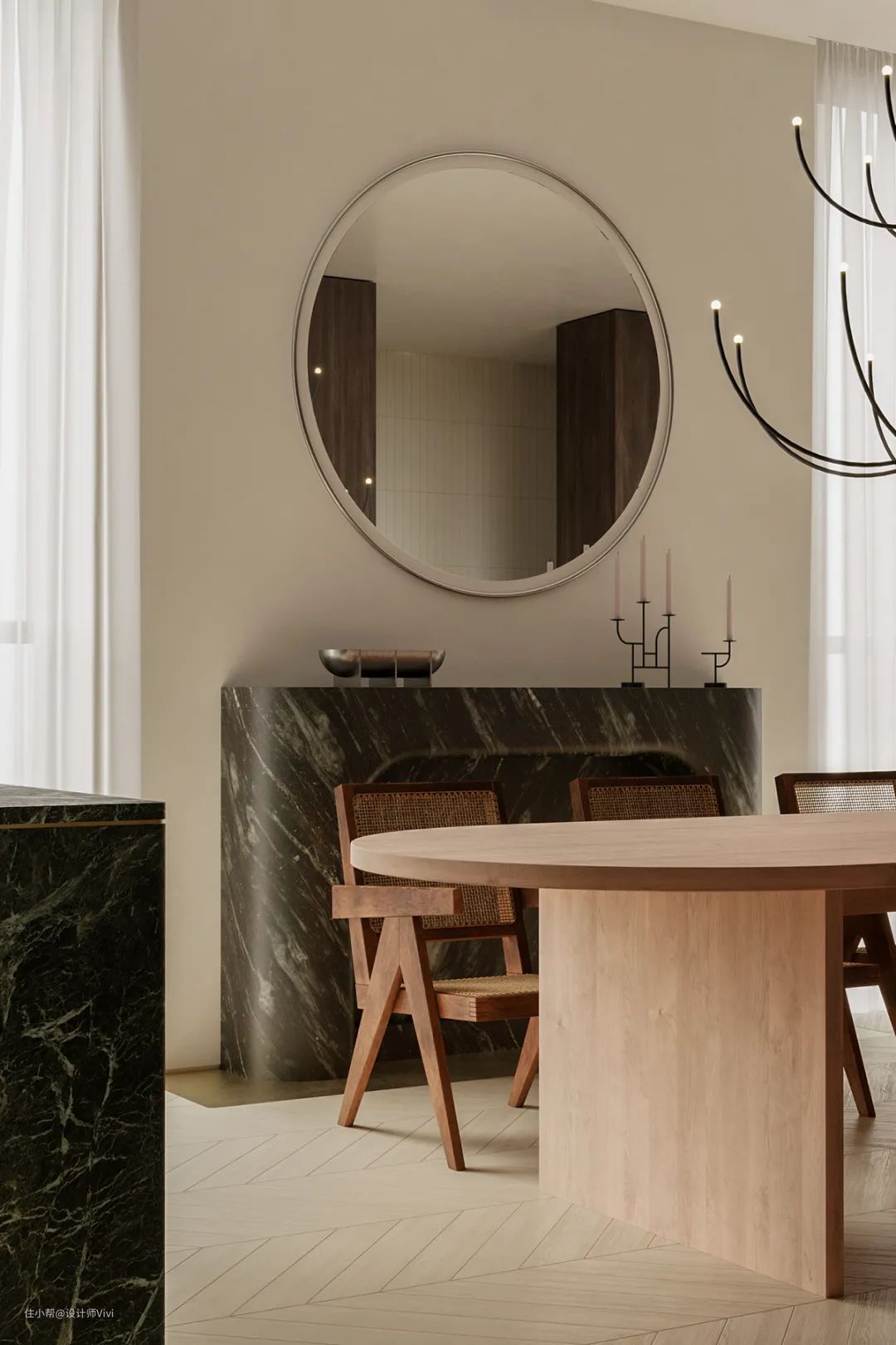 大理石壁炉与圆形镜子,搭配上家具柔和的线条,赋予了这个角落温润与平和。