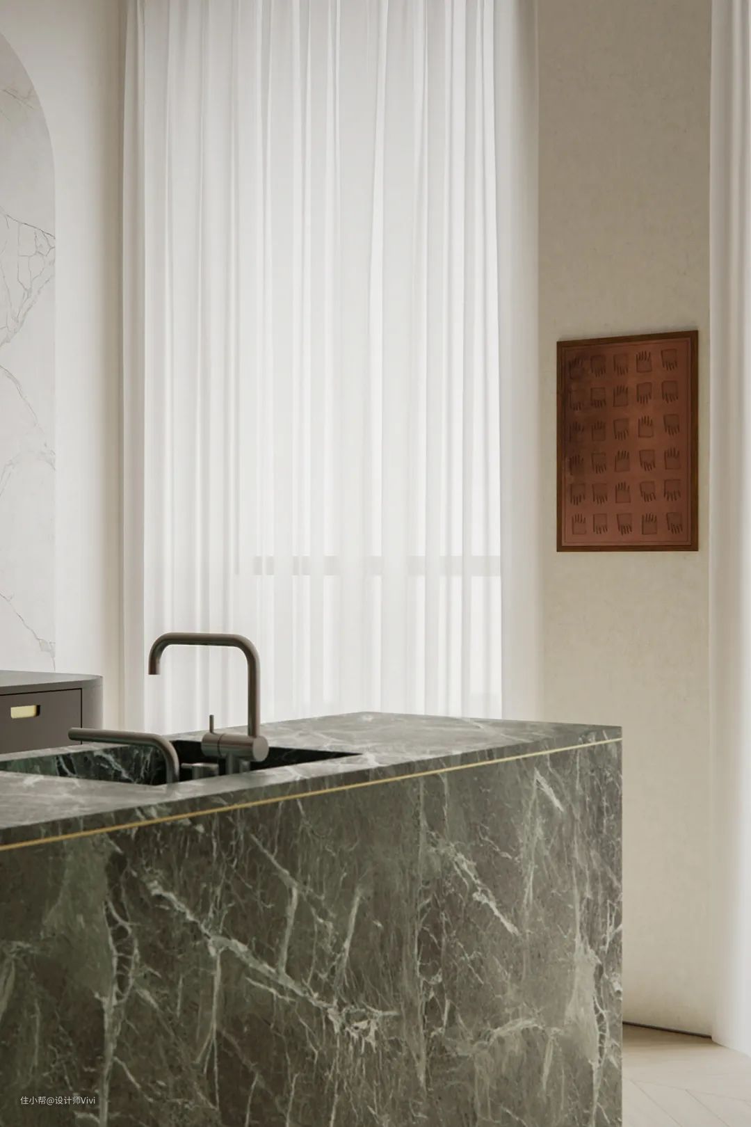 大理石的中岛台非常有质感,增添了台盆丰富了功能性,无形中也作为隔断将客厅与其划分开来。