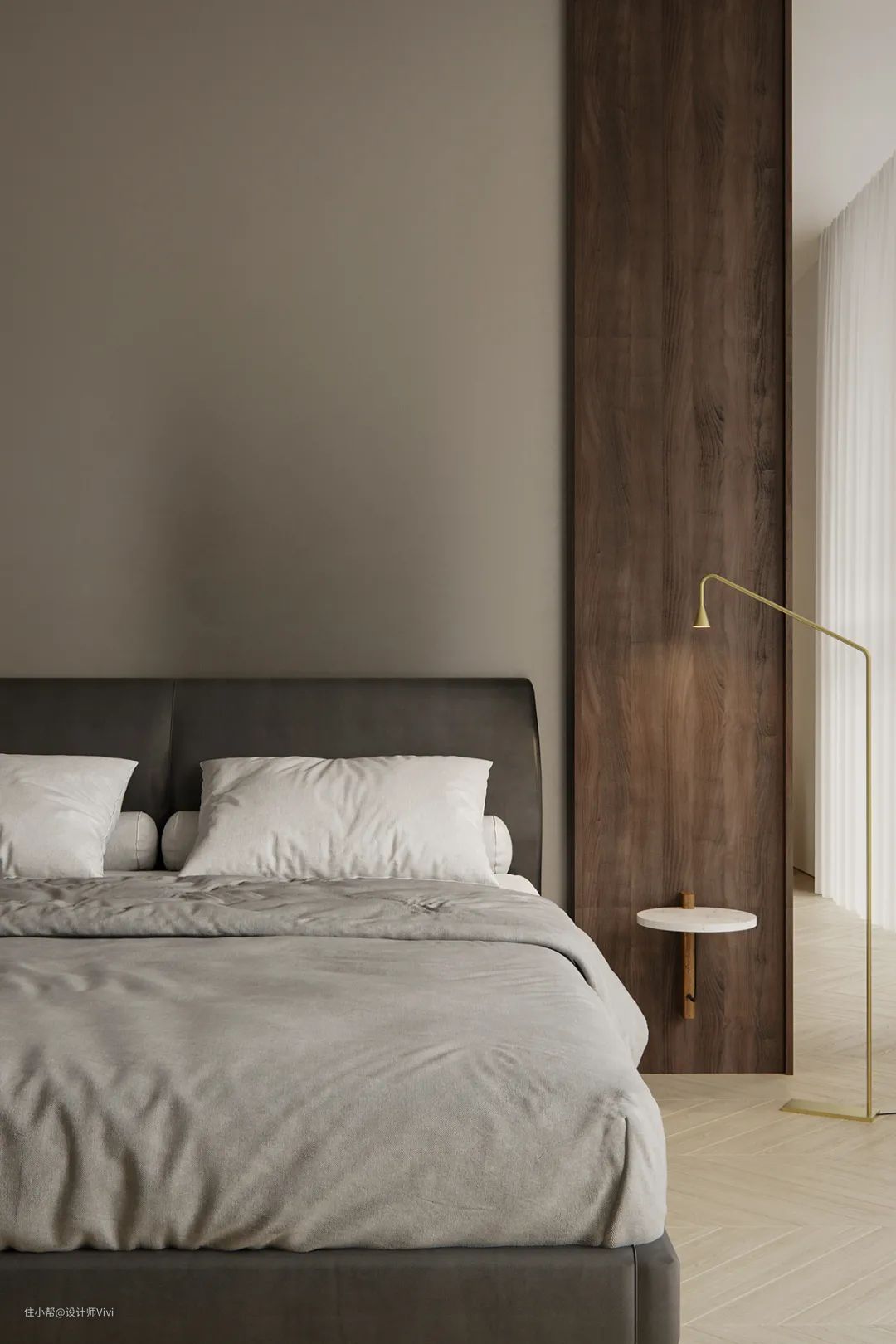 墙面采用低饱和度的色调,与木饰面做了一个拼接,搭配上金色的落地灯和简易的床头柜,营造出温馨舒适的空间氛围。