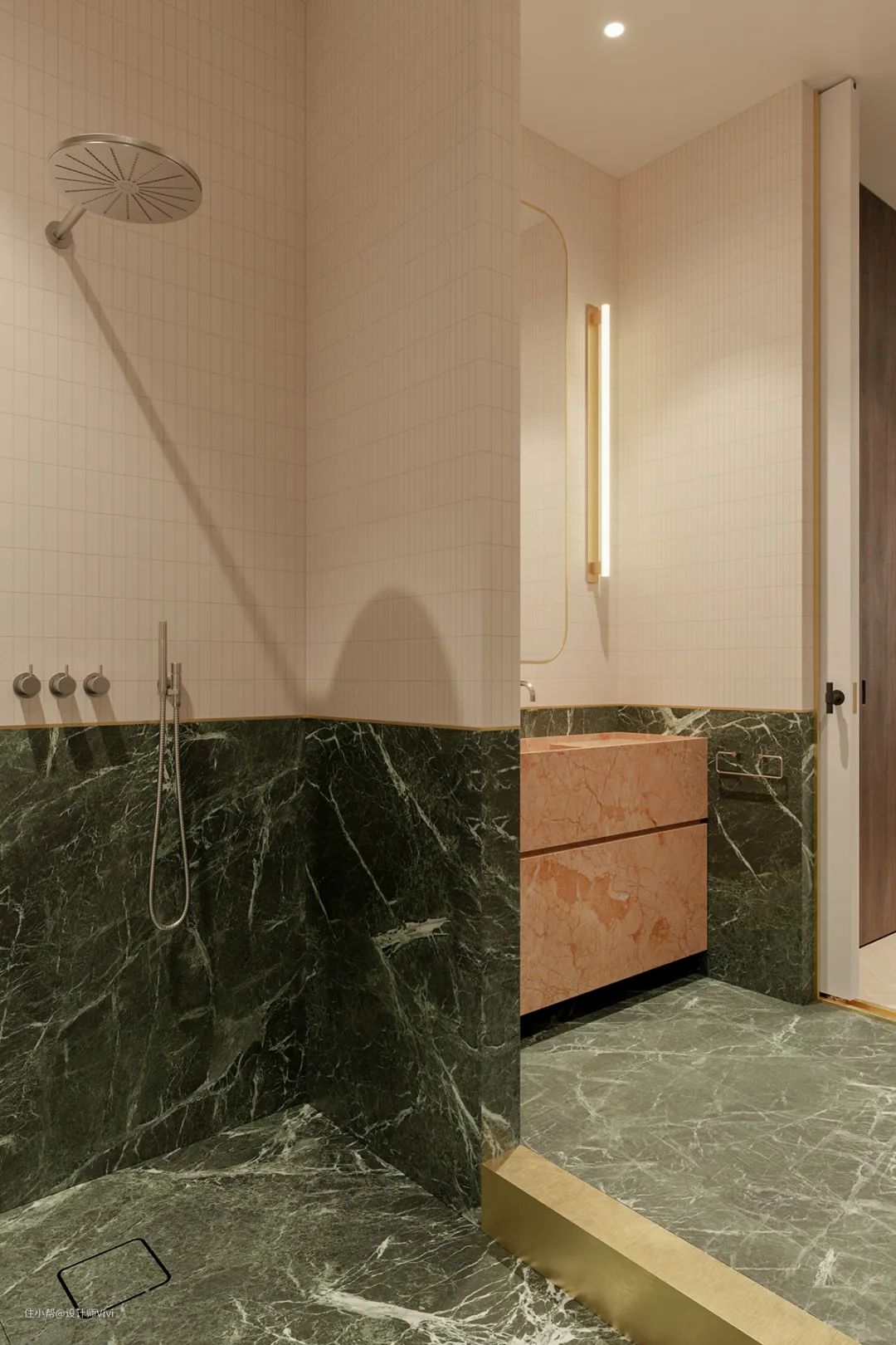 内部设计也质感满满,无论是地面、洁具还是金属配件乃至灯光,都能感受到其中的高级。