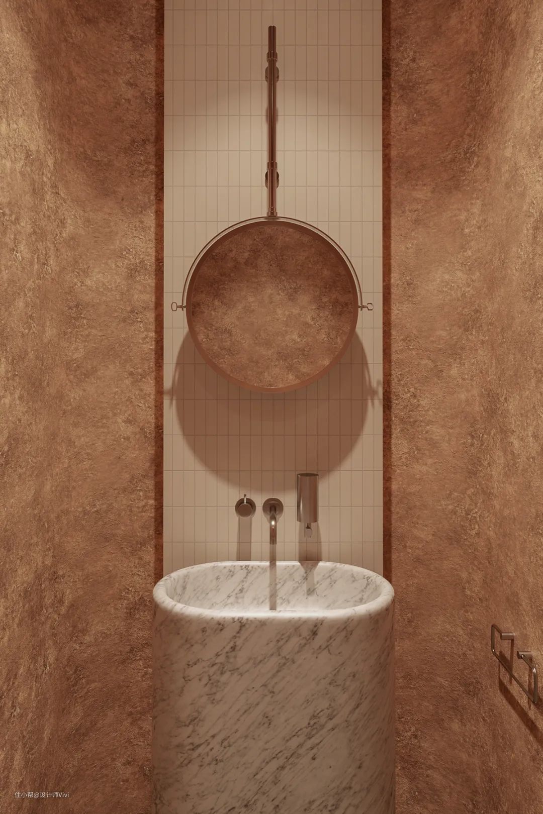 暖色系的客卫,大理石洗漱台是白色的,搭配上圆形的化妆镜,完美的贴合了条形的瓷砖背景,让整个空间显得更精致。