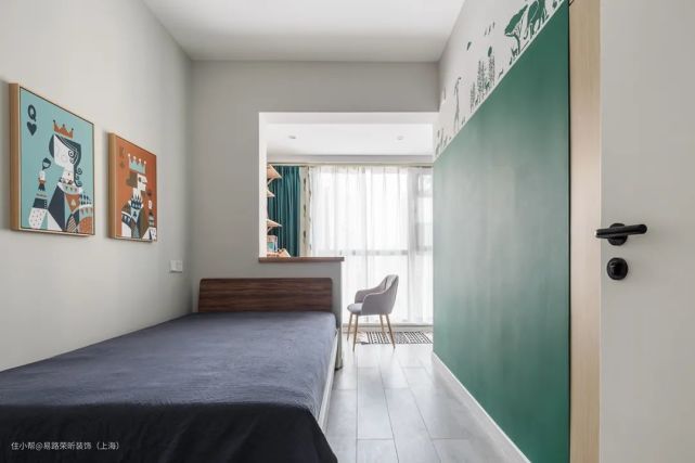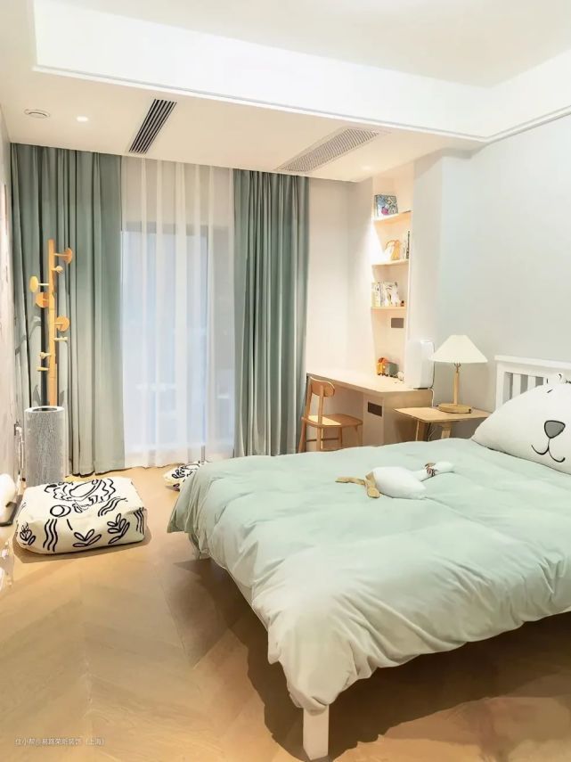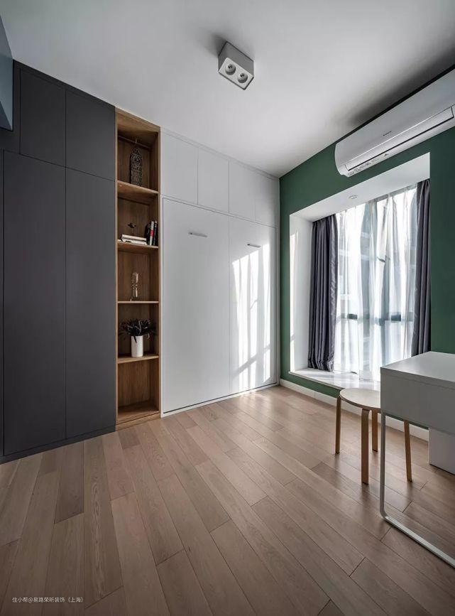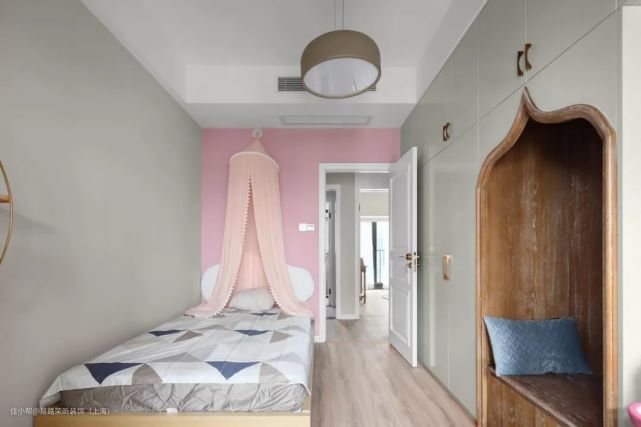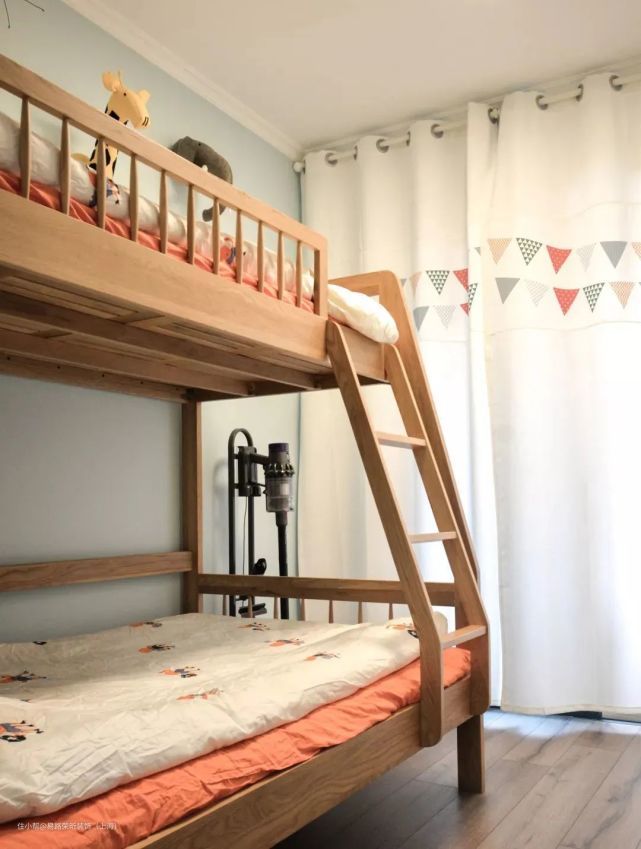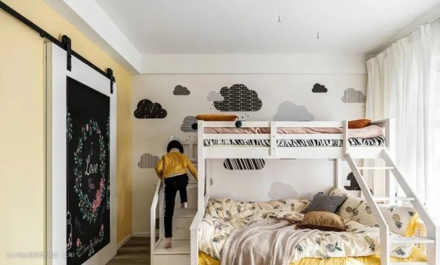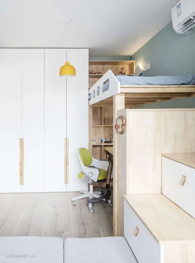 另外,如果觉得次卧储物空间不够,不妨搭配一组梯柜,孩子可以攀爬、还能储物,也能当游戏区,一举多得。