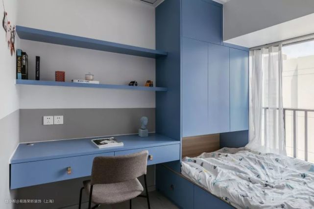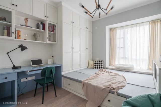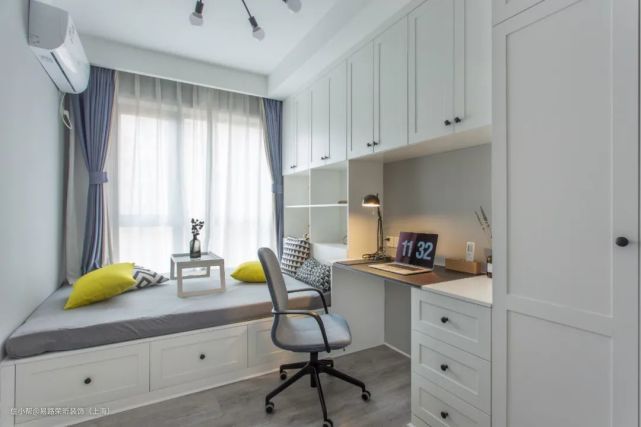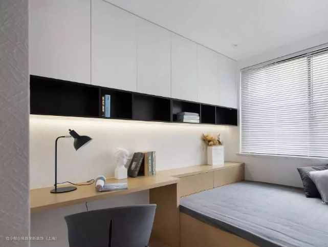 对于小户型来说,如果儿童房实用又能节省空间那是最好的。榻榻米+书桌+衣柜的设计,满足业主的期望。床尾的衣柜和榻榻米下面的空间,都可以用来收纳小孩子的衣服和玩具等用品,且不占地方,这样设计的好处就是,除了床和书桌以外的空间都可以做孩子的休闲活动区。