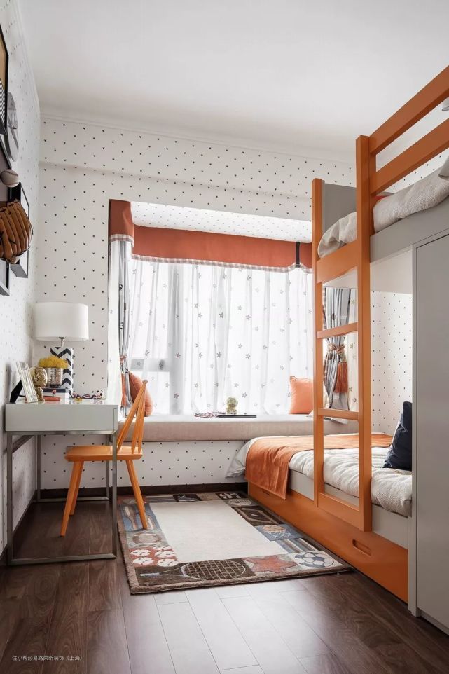 有些业主会把次卧用于儿童房布置,如果小孩比较小为了方便照顾和老人一起住,可以选择高低床的次卧设计。既节省空间,又有童趣,小孩都会很喜欢。