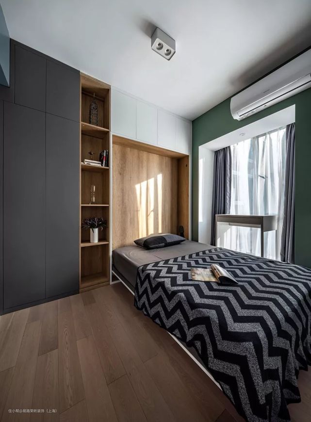如果家里书较多,床头或床尾的位置也可以不做衣柜,可以做书柜的延伸设计,也是不错的选择。