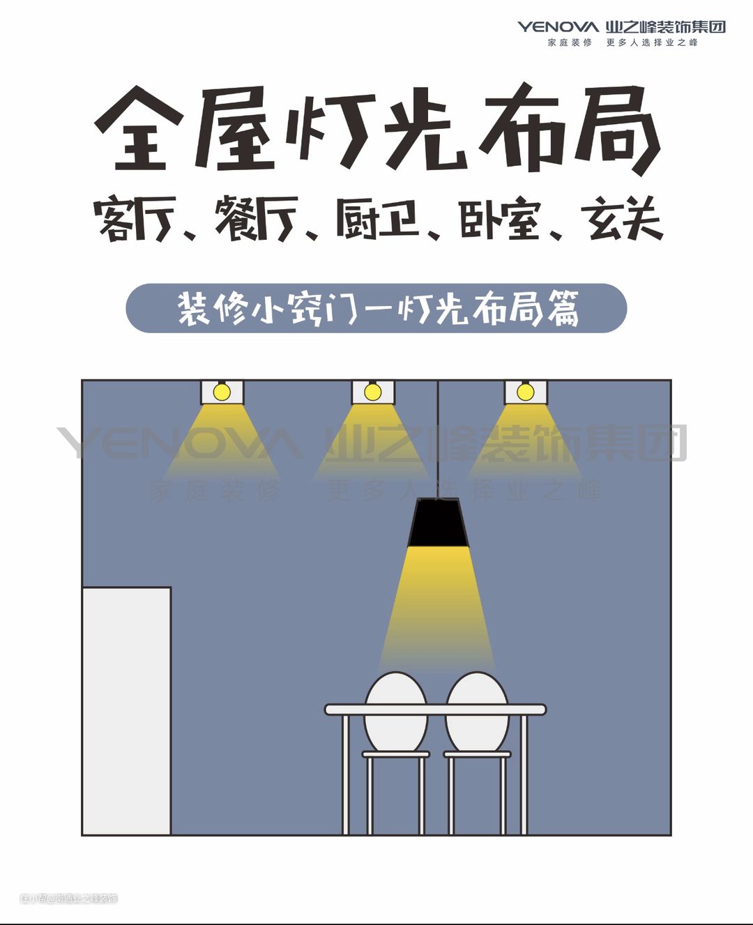 餐桌灯光设计记住一个规则:基础照明选筒灯,餐桌照明选吊灯。需注意:吊灯高度离桌面60cm左右;吊灯的光源建议选择暖色光源,让人更有食欲。