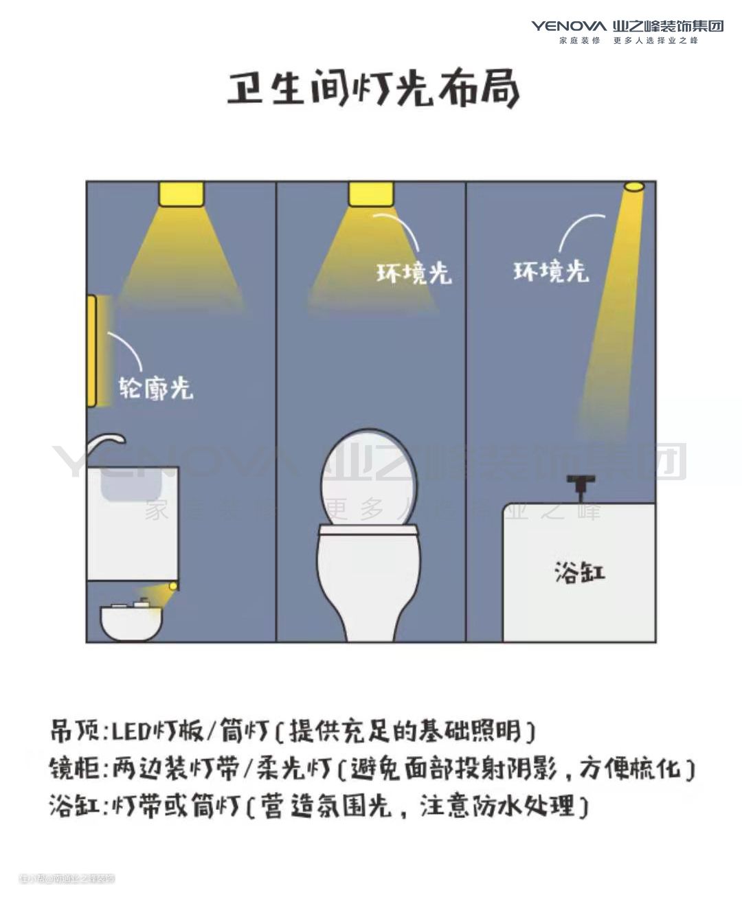 台盆区选择镜前灯,淋浴区选择吸顶灯或筒灯,马桶区如果没有上厕所阅读习惯,可以不装,有的话可以装筒灯或阅读灯。