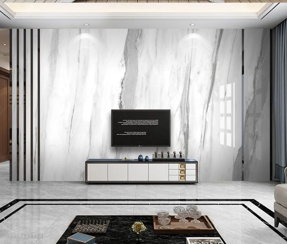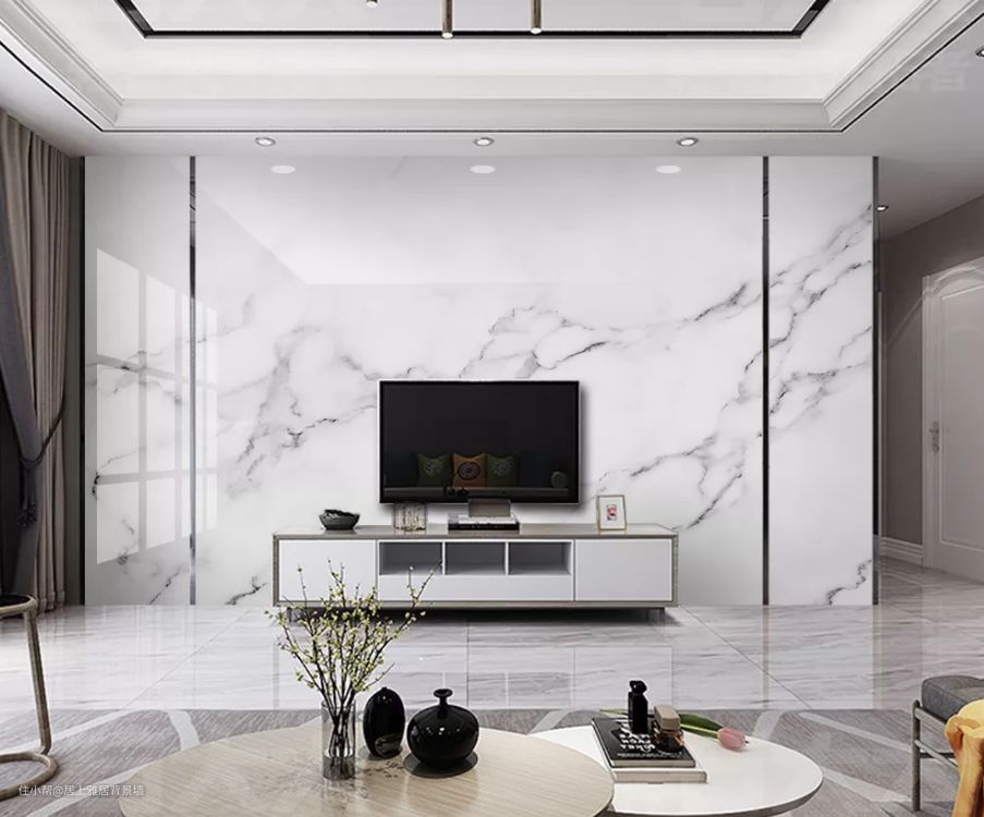 极简主义风格的爵士白鱼肚白大理石纹电视背景墙