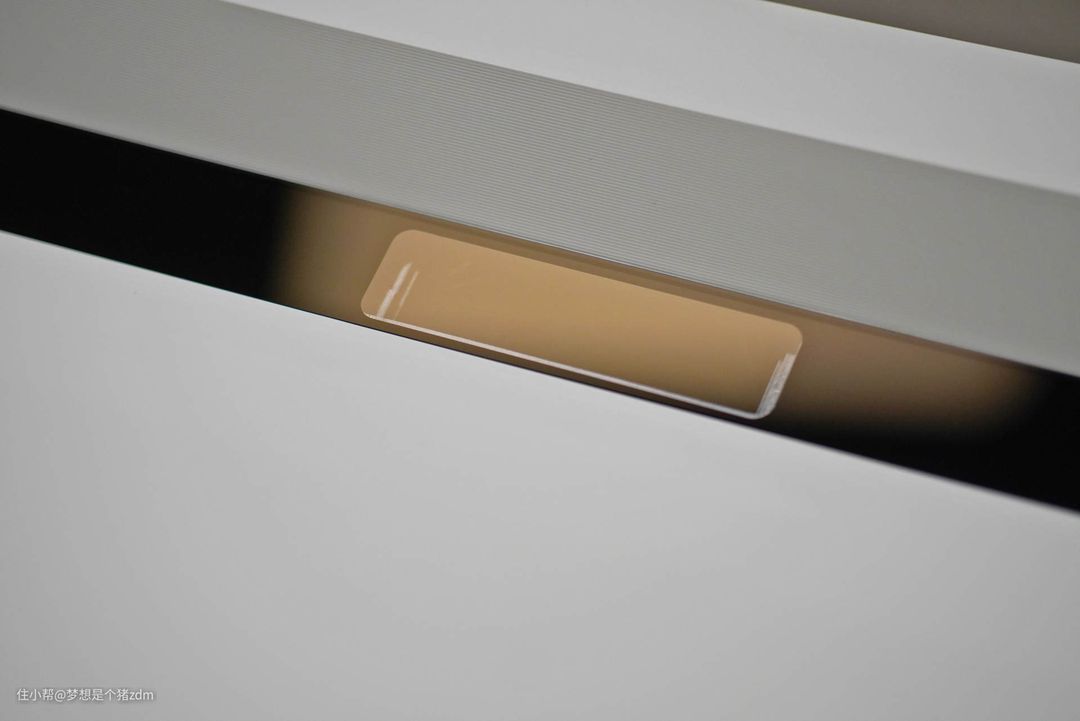 在机身顶部的黑色长条形区域内,隐藏着的是这款机器的投射镜头以及左右两侧用于自动对焦的ToF激光和COMS摄像模组。