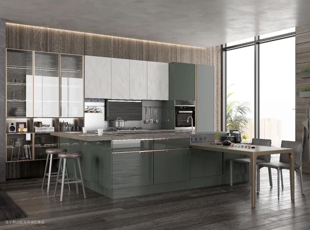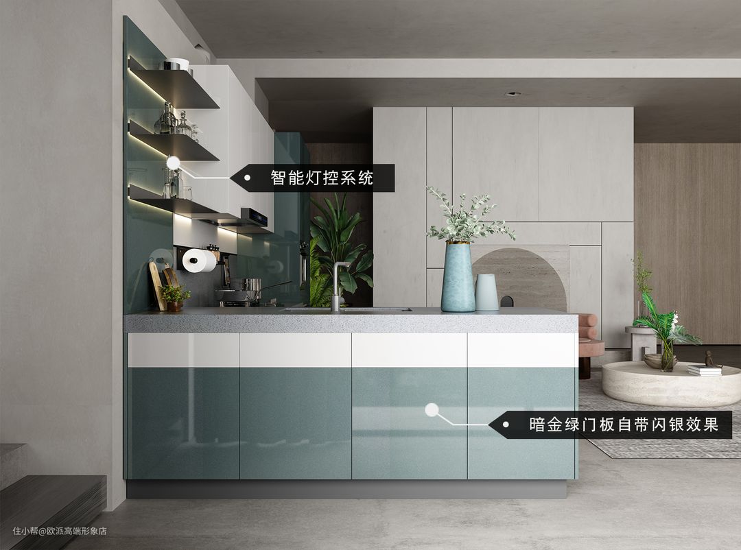 带有闪银效果的绿色源于自然雨林的启发,在灯光点缀和白色门板的映衬下,大面积暗金绿更具视觉冲击力。