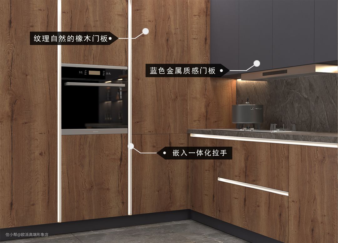 全新灯光壁挂系统2.0,营造出宁静素雅的氛围;金属拉丝门板自带光感,让厨房空间更加敞亮,且抗污性强易于清洁。