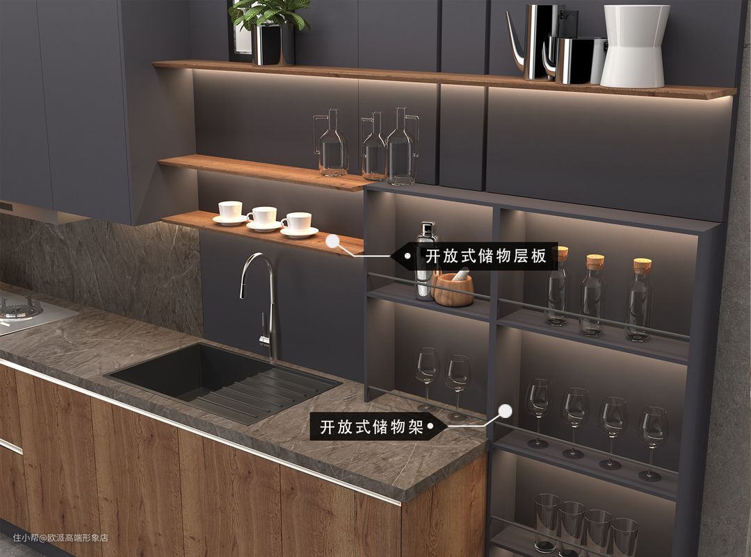 金属开放架适合调味品和精美厨房用品收纳,玻璃高柜可用于存放红酒及玻璃器皿,内置氛围灯光能够带来额外照明,增添品质生活乐趣。