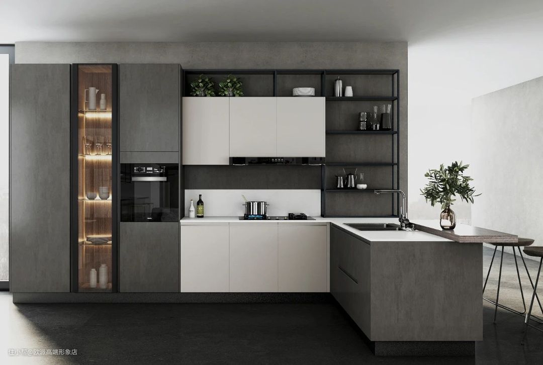 灰色系林海配色经典稳重,整体空间层次分明,疏密有致;金属开放架和吊柜搭配合理,让隐藏与开放并重,大大减弱压抑感,给空间带来一丝轻盈灵动。