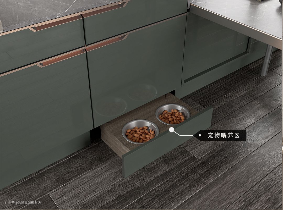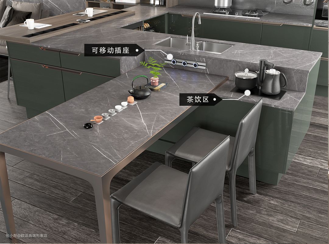 三面开放式G型布局集众多功能、新潮有趣,如宠物喂食、可移动插座、茶饮区等,为厨房生活带来更多便利和新鲜体验。