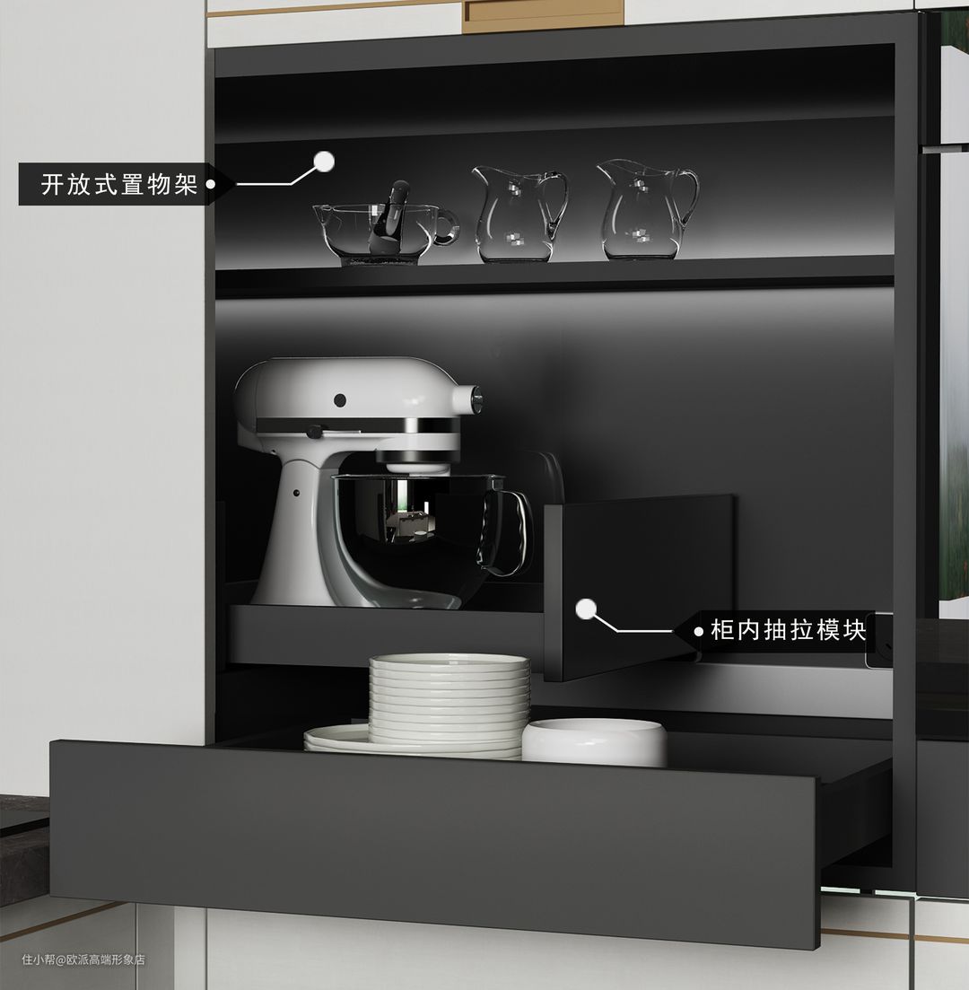 高柜中带有柜内抽拉模块、小家电柜及台上功能置物架,为转角柜提供收纳方案,大大提高空间利用率。