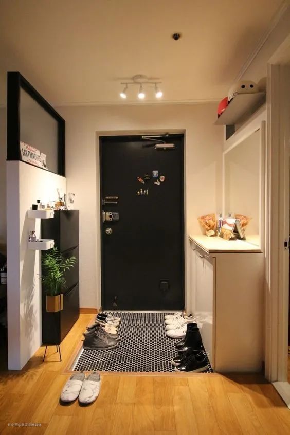 在方正的小户型当中,是最难做玄关的。可以利用地面材质的反差,做出2公分左右的落差,放上合适的地垫,然后利用隔断制造小空间,从视觉上营造出一个类似日系的入户玄关。