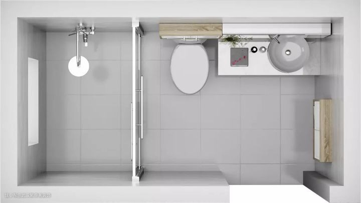 三分离的卫生间装修,适合面积较小的长方形卫生间,所有功能区一字布局,紧凑排列,节省占地空间。