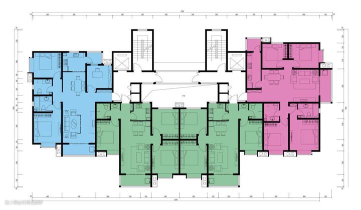 单看绿色户型符合南北通透动静分离等优点,但我们注意北部是一条消防连廊和墙体,北卧和厨房的采光和通风大打折扣。粉色和蓝色才是真正的通透户型。1到3层的户型还可能会有突出的墙体大厅,商业综合体,所以看房一定要看楼层平面图。这个售楼部都会有,但是部分置业碍于缺点不一定会主动提供给你。