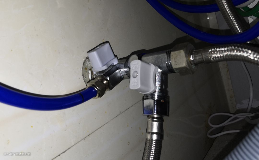 ▲连接进水管的则叫1进2出三通角阀,接口为4分口,洗碗机中都有标配,如果你还需要安装净水器等,则可以和我一样,用两个1进2出三通角阀组成一个1进3出四通角阀。安装这个的时候注意先把进户总水闸关掉,安装结束后再打开水闸即可,别的没什么难点。