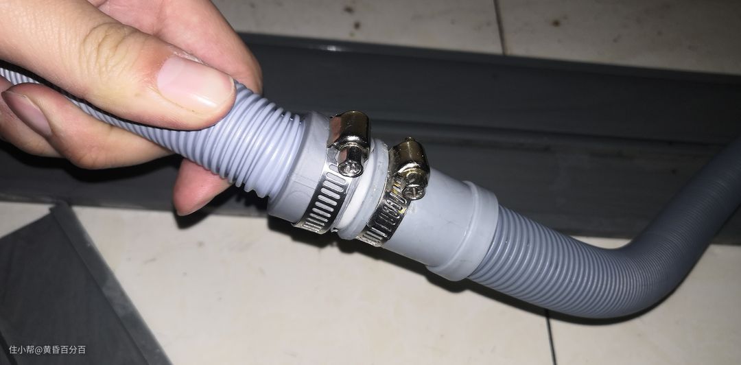 ▲通过排水管连接器将两段排水管连接好后,再将这个带有螺丝的卡箍套在两个排水管与对接管连接的地方,拧紧上面的螺丝,这样连接处就不会漏水了。