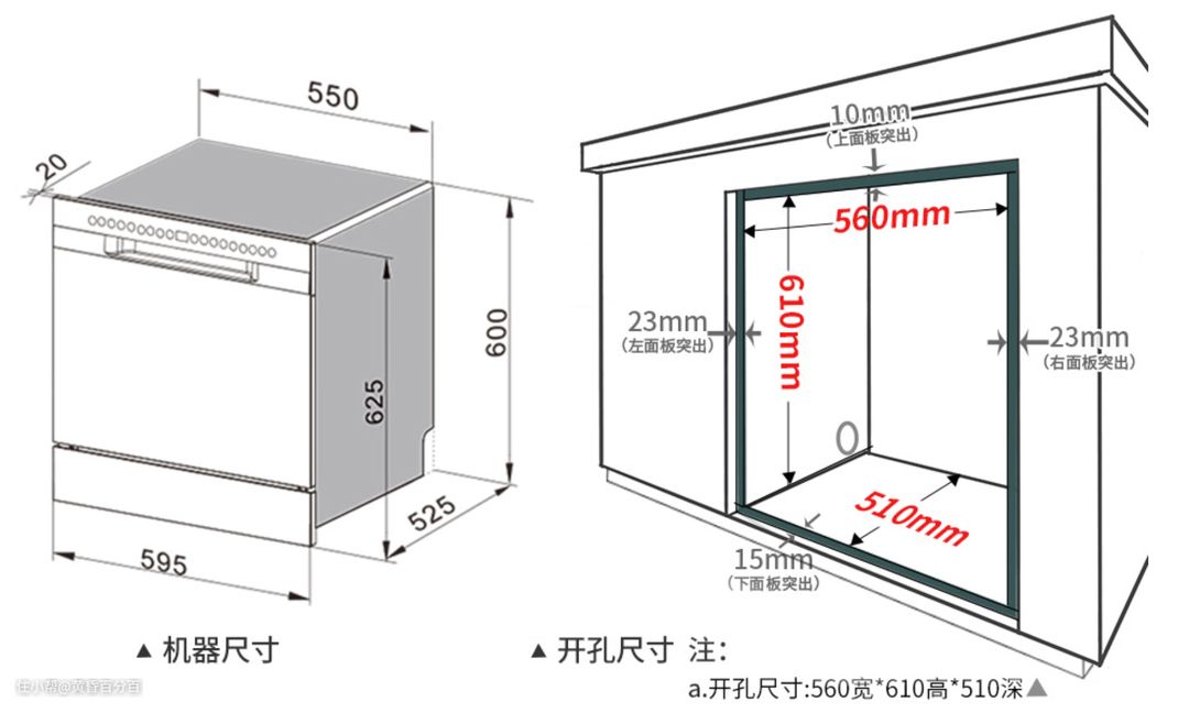▲洗碗机在容量方面可分为主流的8套及13套洗碗机,还有相对小众一点10套、12套洗碗机等。经过测量,我的橱柜开孔尺寸约为560mm宽*650mm高*550mm深,属于标准消毒柜的开孔尺寸,最大可以装下10套的洗碗机,因为现在只有两个人使用,所以决定购买8套的洗碗机。以我个人此次购买的HumanTouch慧曼 8套洗碗机为例,开口尺寸只需要560mm*610mm*510mm,安装毫不费力。