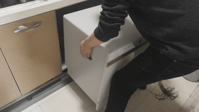 ▲水电都连接好之后,将洗碗机放入橱柜的开孔中就大功告成了。