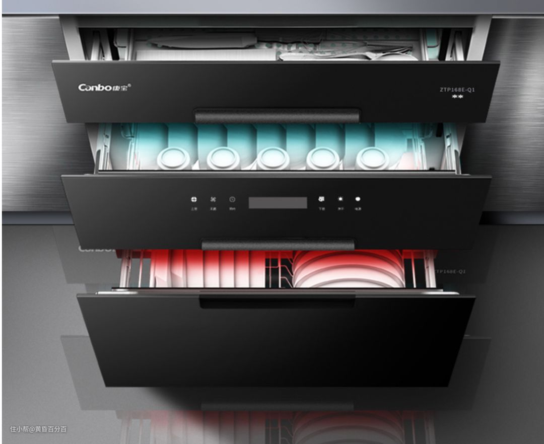 ▲因为消毒柜内对餐具摆放角度要求较低且机械结构相对简单,所以在同尺寸下,消毒柜能够拥有三层大抽屉而洗碗机只能有两层的洗碗架,但就存放能力来说,消毒柜基本都比同尺寸洗碗机强不少。且高端消毒柜与洗碗机都有定时二次消毒等功能,均可以保证碗筷长期存放也不滋生细菌。