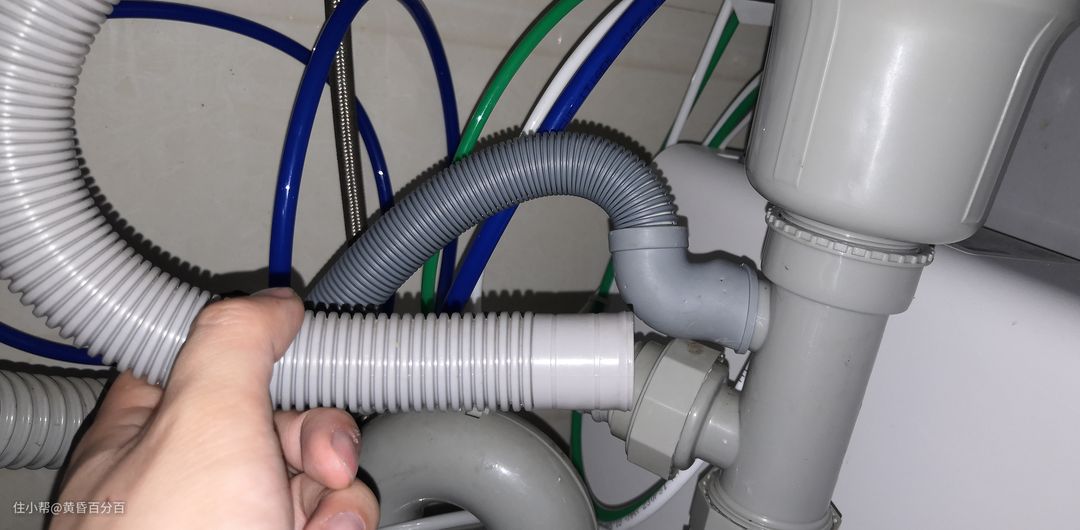▲当然,如果你的水槽有防溢接口的话,可以短时间将防溢接口的管子取下,直接安装洗碗机排水口过渡。我因为最近计划换水槽以及安装厨房垃圾处理器,所以暂时就这么将就下。