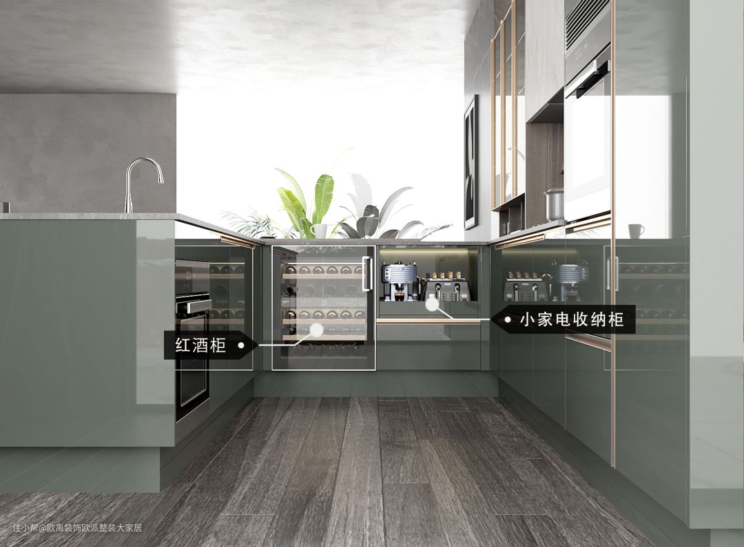 隐藏式小家电收纳柜设计,使橱柜看着更加简洁大气;分格酒柜加透明面板,既实用又防尘,让厨房更具品味。