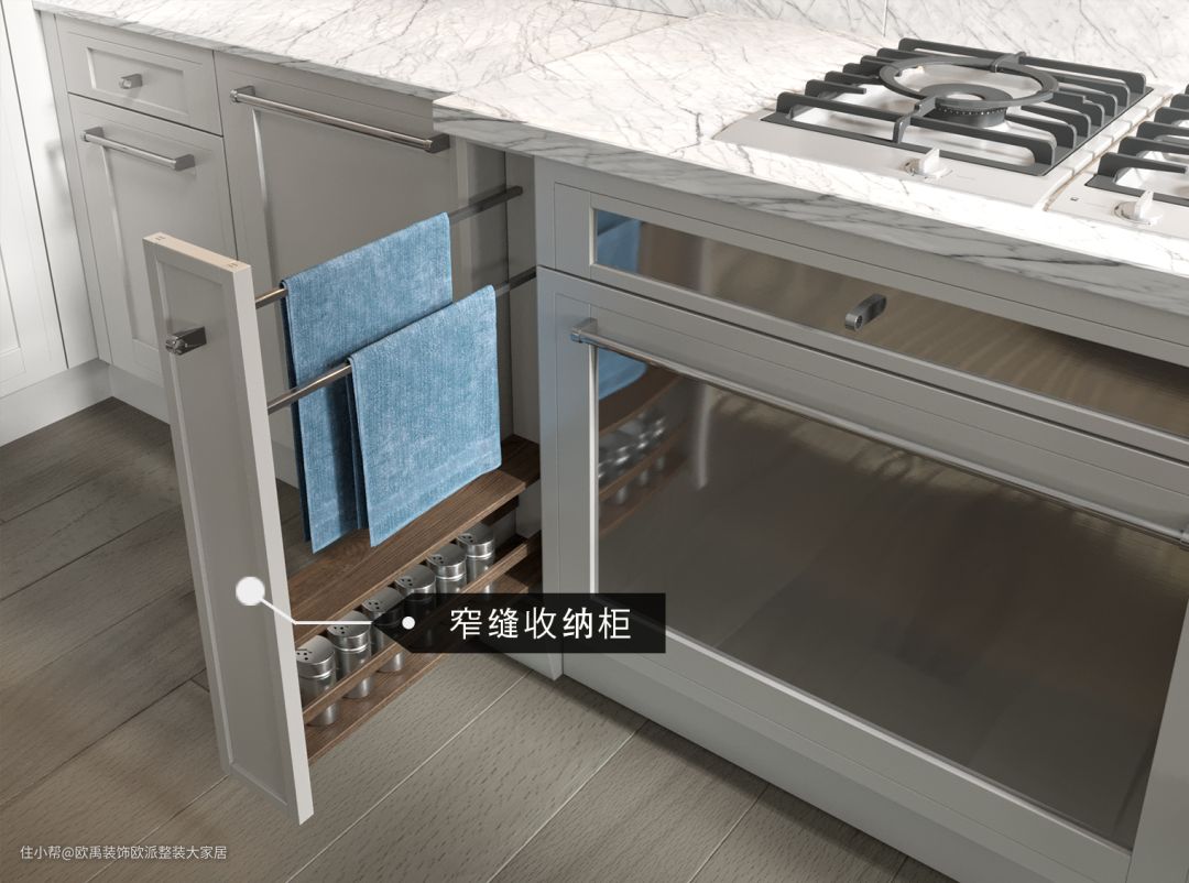 窄缝收纳柜、抽拉案板、分格抽屉、嵌入式洗碗机等高效利用地柜空间,根据烹饪习惯合理分布,为厨房生活提供更多便利性。