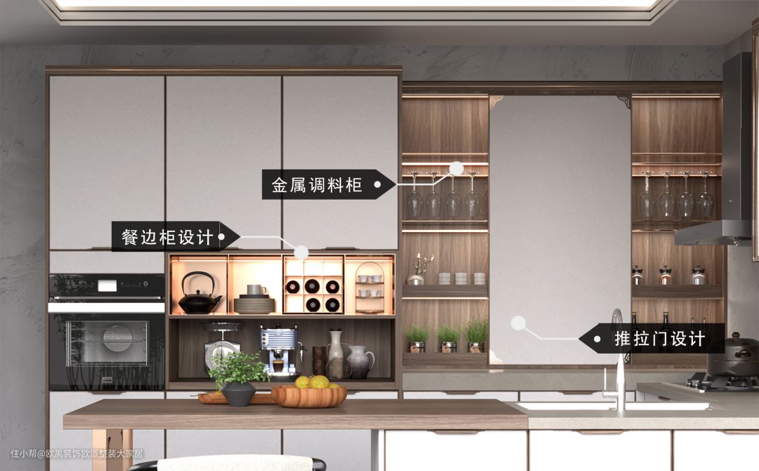 台上柜金属调料柜采用推拉门设计,方便平时轻松取物;烤箱与餐边柜结合设计,操作便捷且功能完善。