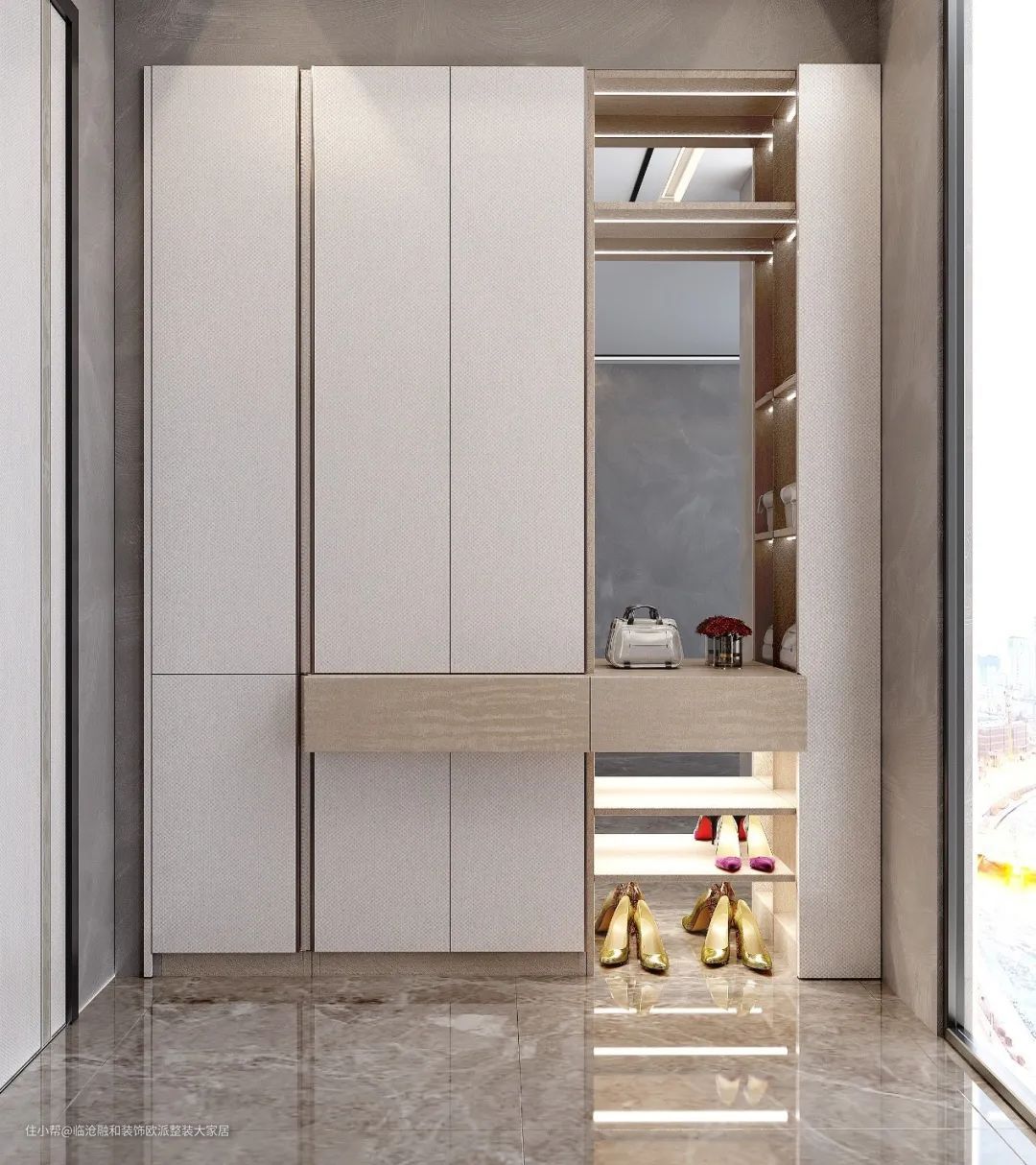 玄关柜底部抬升10-15cm,可以用到放置一些常用的鞋子了。这样方便很多,回家换鞋之后,只要把鞋子放到底部空余的位置即可。不用再去打开鞋柜这个步骤了,又可以让门厅干净整洁很多。