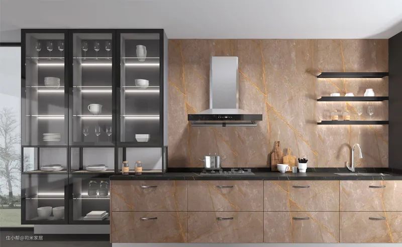 厨房台面的颜色一般会跟橱柜的颜色不一样,能够让橱柜更有层次感,一般来说,浅色系可以搭配较深的台面,深色系则可选择较浅的台面。