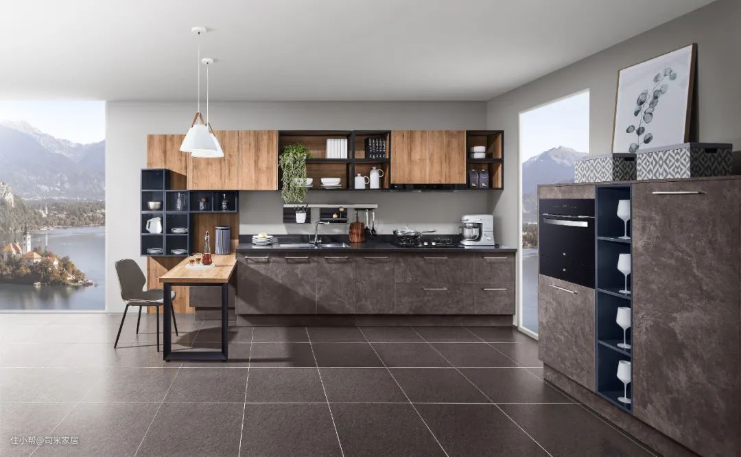 大多数厨房台面配色都选用中色系,黑白灰等就是百搭的选择。