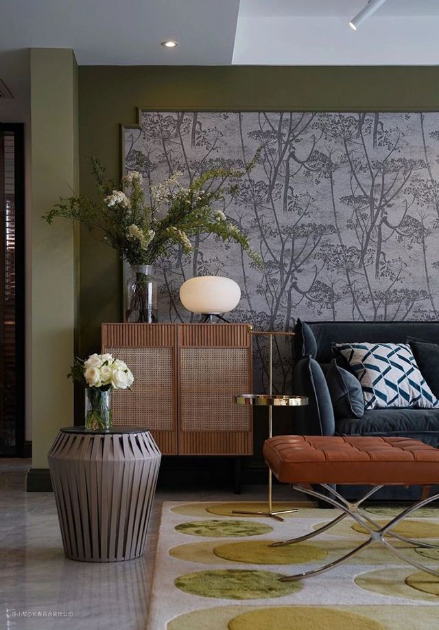 入户空间灵感来源于中国传统建筑中的影壁,选用一款写意丛林图案的墙纸,加入精简提炼的装饰线条,增加墙面的形式感,搭配球形台灯,营造了「明月松间照」的意境。