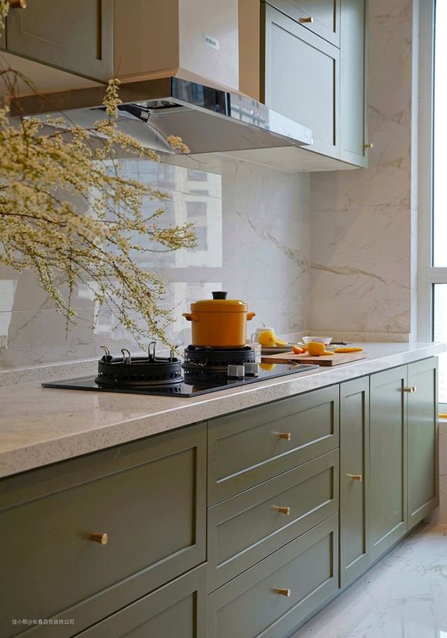厨房硬装是交付时已经做好的,由于预算有限,墙砖与地砖都没有更换,在当地做了橱柜柜体,为了配合客厅餐厅的色调风格,柜门颜色款式是合作厂家设计定制然后现场安装的。