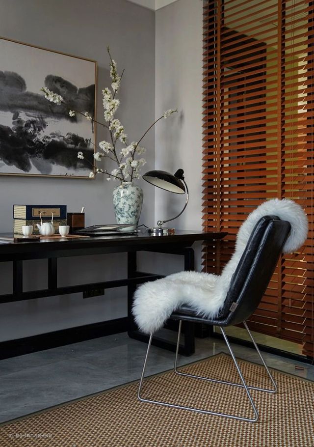 书房相比其他空间,更有中国水墨画的气质。墙面为浅灰色,设计定制了新中式的大书桌,搭配华裔法国画家赵无极的抽象泼墨画,加上工业复古风的台灯、座椅,整体呈现硬朗、简约,又不失东方韵味的风格。