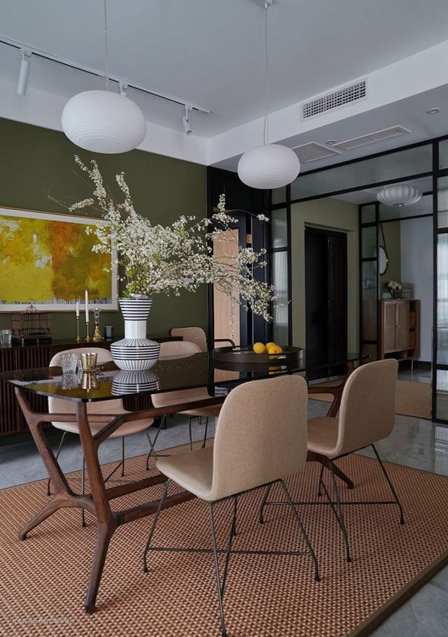 以海松色打底,杏仁色餐椅、玳瑁色玻璃餐桌、胡桃木色餐边柜、剑麻地毯等偏棕色调的大地色相互映衬,整个空间洋溢着轻快的田园气息。