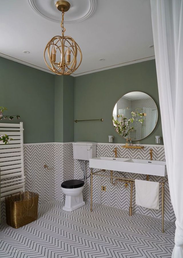 主卫整体采用白色波浪纹花砖,地面和墙面一体,半墙处理,搭配灰绿色墙漆,轻盈而优雅。