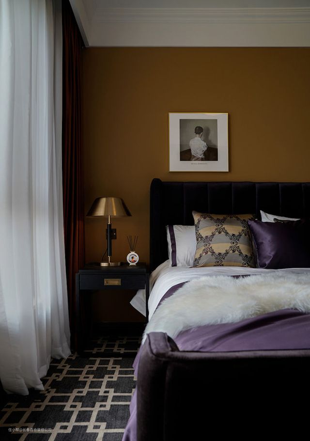 次卧为偶尔来住的婆婆准备,也兼做客房。婆婆是位时尚的长辈,因此这个房间运用较为大胆的配色,琥珀黄搭配紫色与红色,浓郁深沉,深邃神秘。
