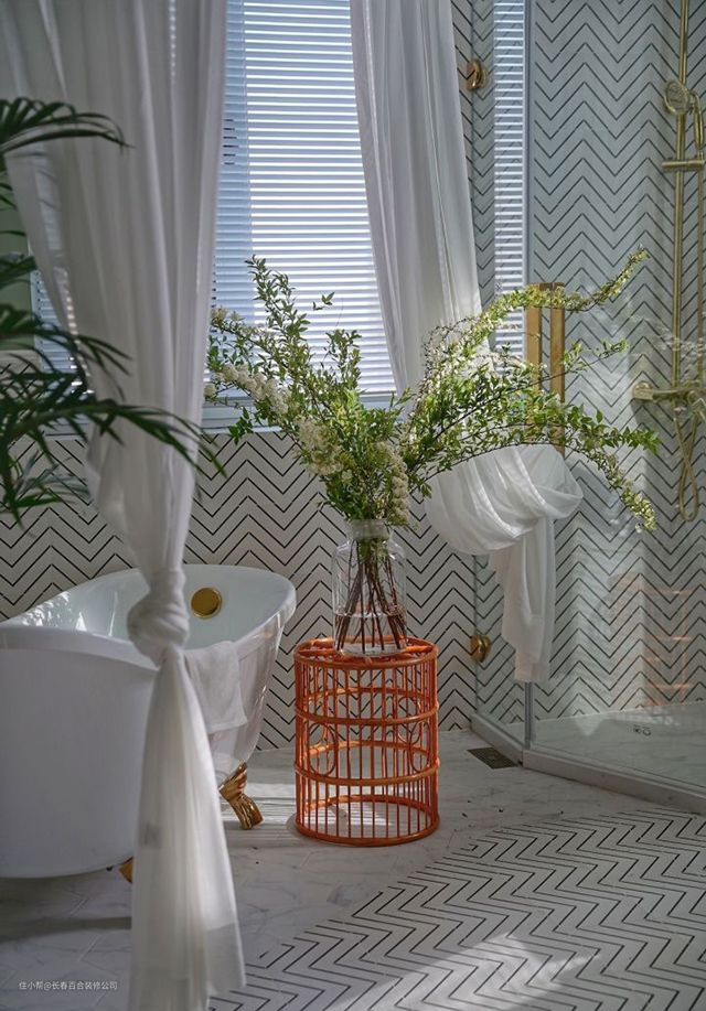 浴缸区定制了弧形纱帘轨道,圈定出了泡澡区,纱帘轻柔的质感也增加了卫生间的浪漫情调。