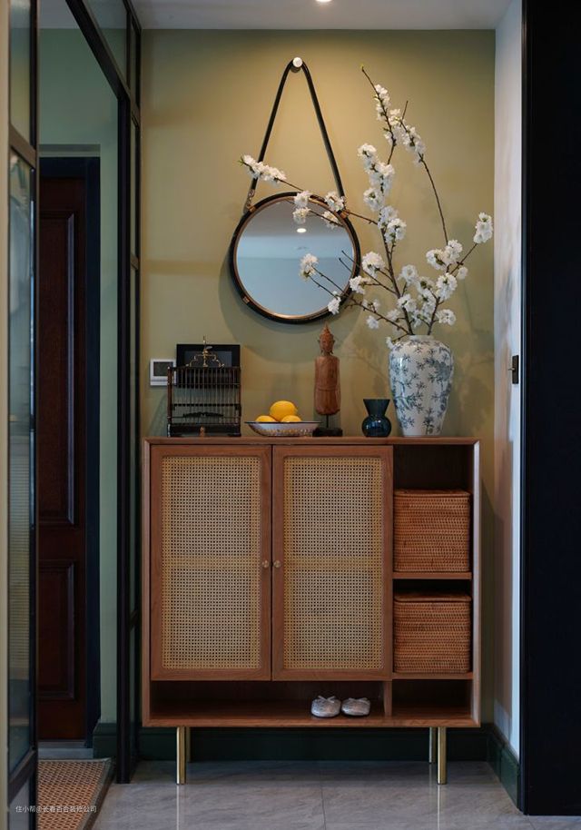 在介于玄关和厨房的过道位置,设计定制了「印尼藤编+樱桃木」的鞋柜,也正好挡住墙上地暖分水器。