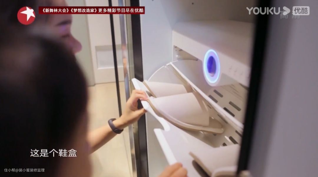 柜门拉开,除了贴心的设计了大衣、雨伞等日常收纳的位置,还内置了一个白色的消毒鞋柜。