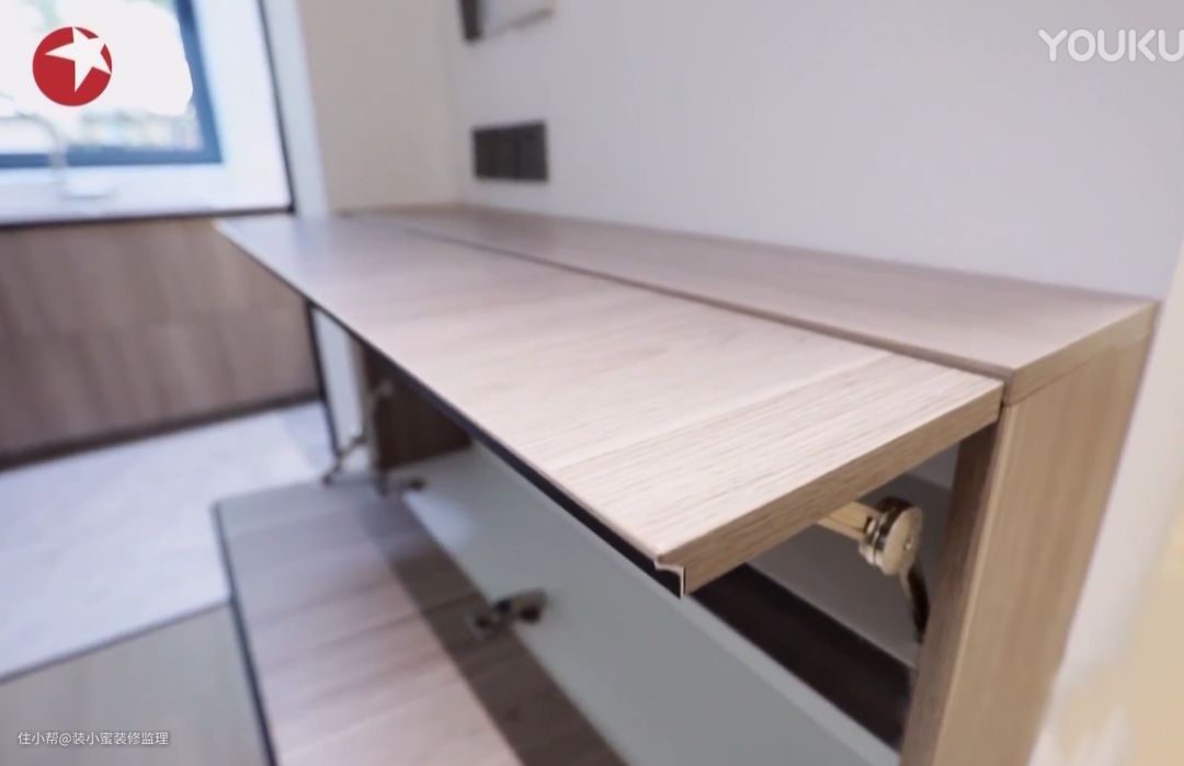 在橱柜拐角的抽屉上,设计师特意设置了个可以承受成年人压力的板子,旁边还设计了烟灰缸!这脑洞我大呼一声淦。