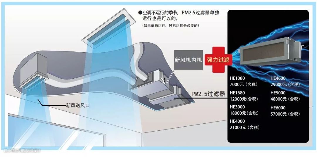 - 室内送风和排风的更佳搭配是顶送风地排风,空气可以更合理地循环更舒适,但限于商品房的结构(层高因素)和安装的方便性(施工难度更大),更多选择了顶送顶排。