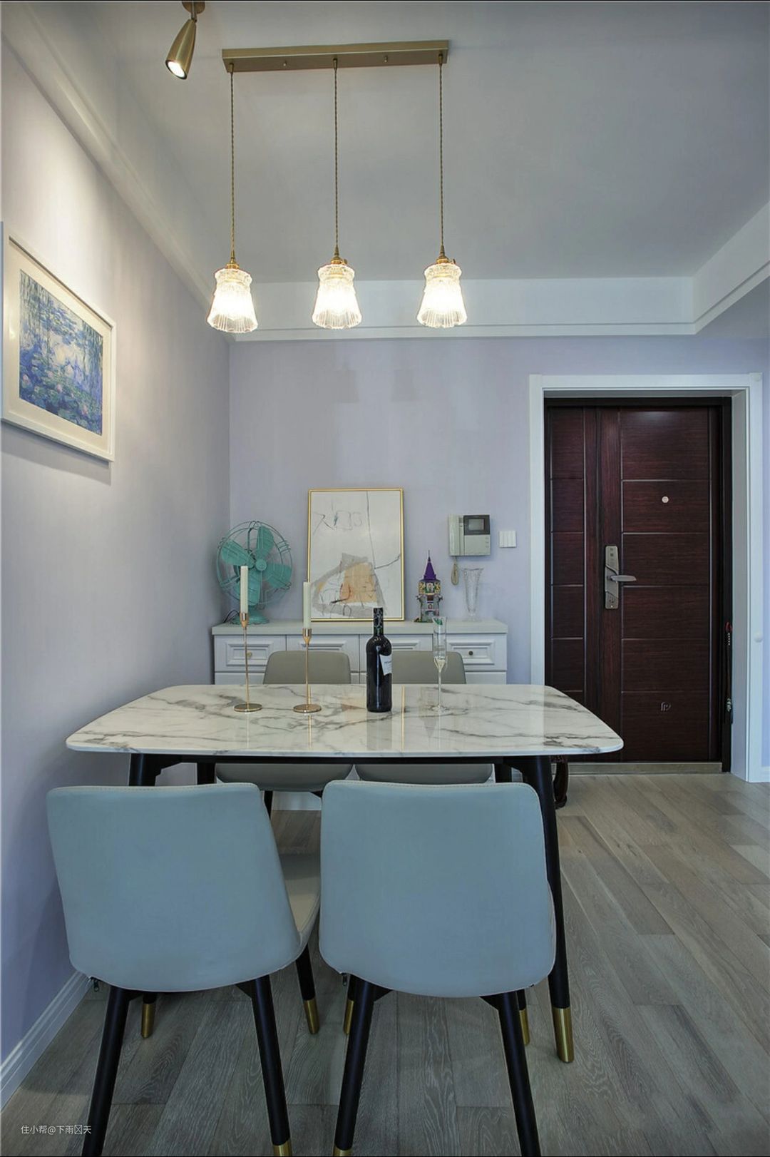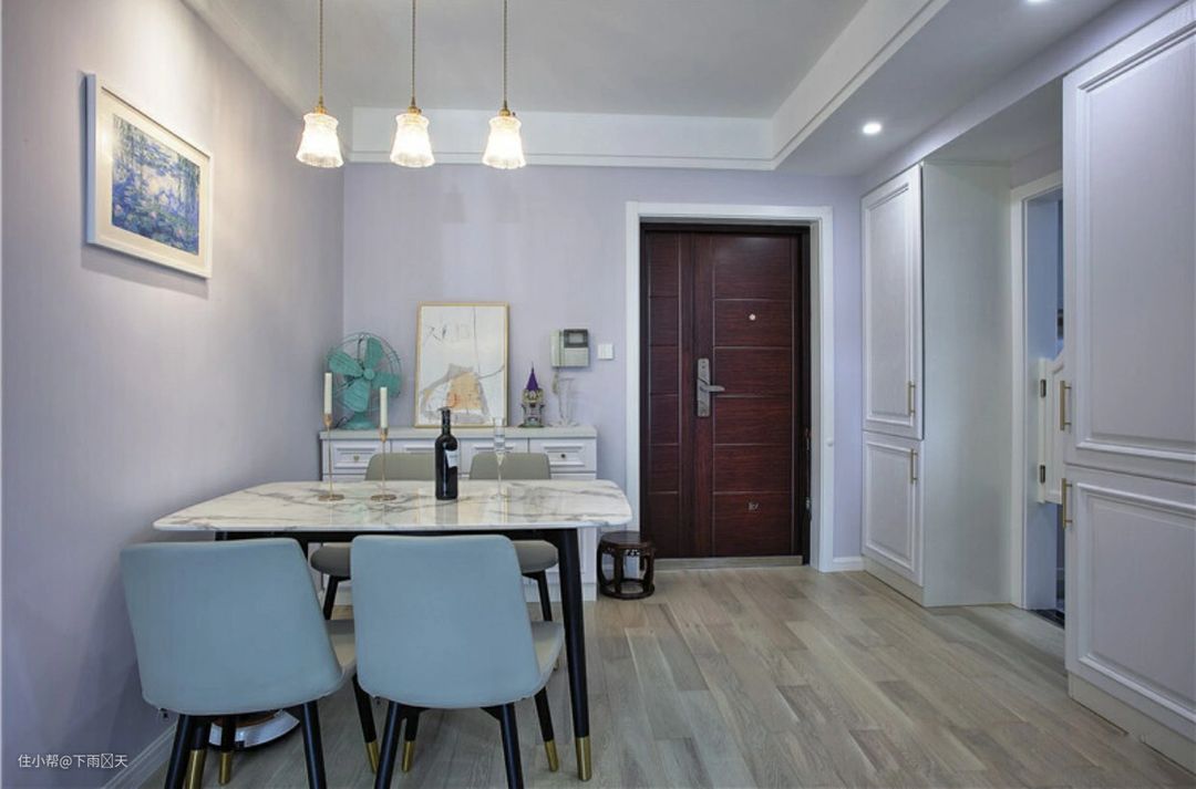 餐厅布置了一张大理石方形餐桌,人多如果需要调整位置的话,非常方便,快捷。搭配的餐椅其中两把是蓝色的,另外两把为灰色,搭配起来色彩上协调的同时,显得更丰富一些。旁边布置了小餐边柜,可以提供更多的储物空间,特别实用。