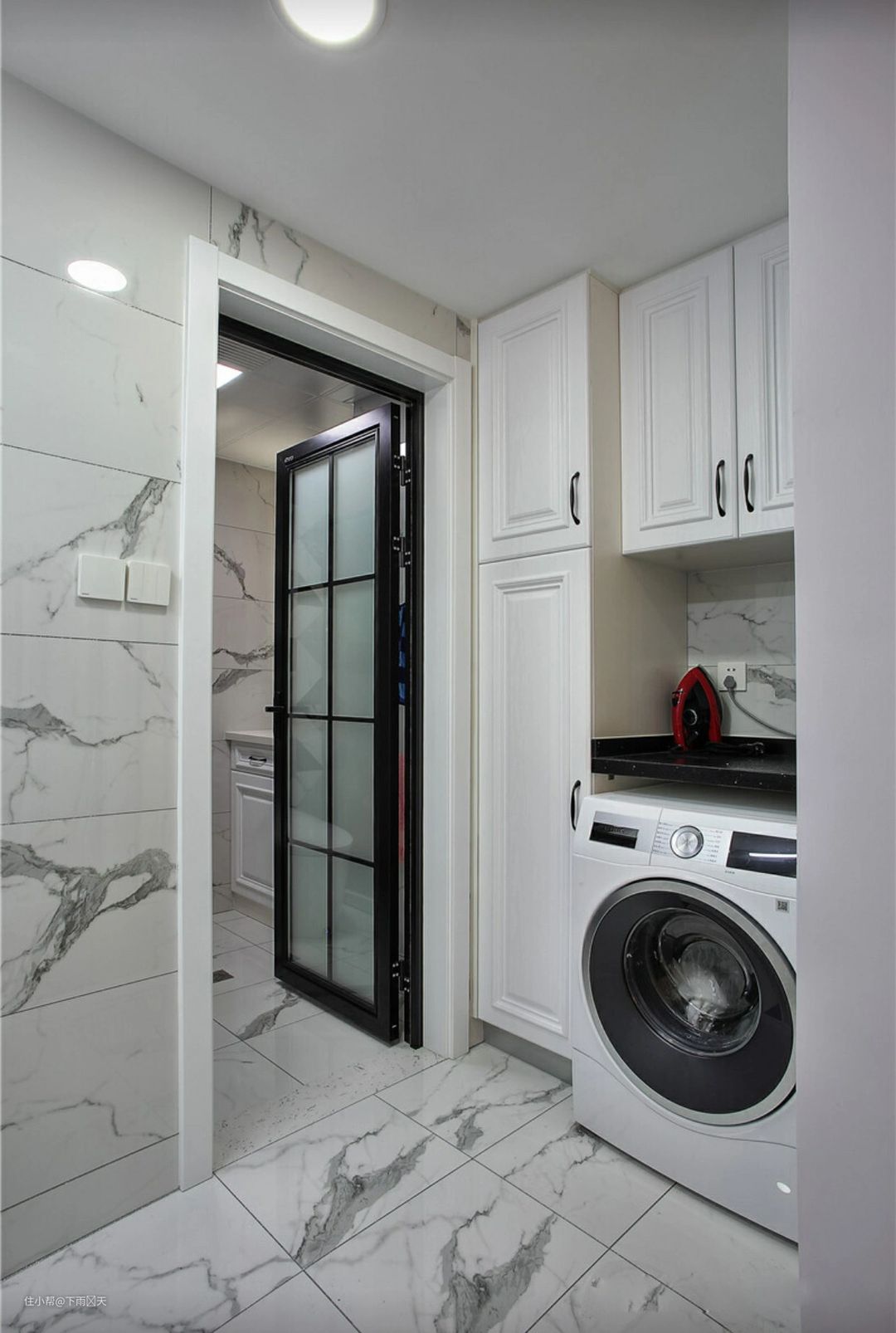 卫生间扩大了,所以这个区域可以划分出来,可以放洗衣机,另外一边就是浴室柜了,更方便使用。