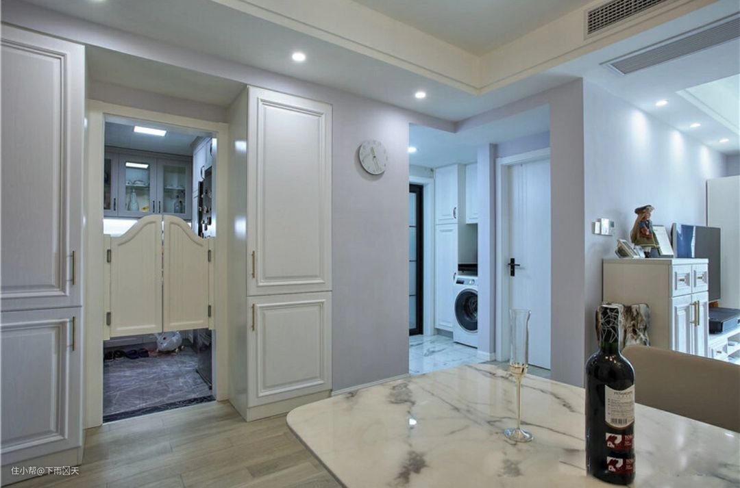 从入户大门进来就是餐厅区域了,利用卫生间门口区域设计了鞋柜,这样就可以满足夫妻俩,以后一家三口的储物需求了,并且不会对餐厅区域造成影响,都安装了柜门,显得比较美观,看着就是一面墙体的感觉,考虑真正周到啊。可能很多人家里一进屋就是属于这样的户型,可以参考一下。