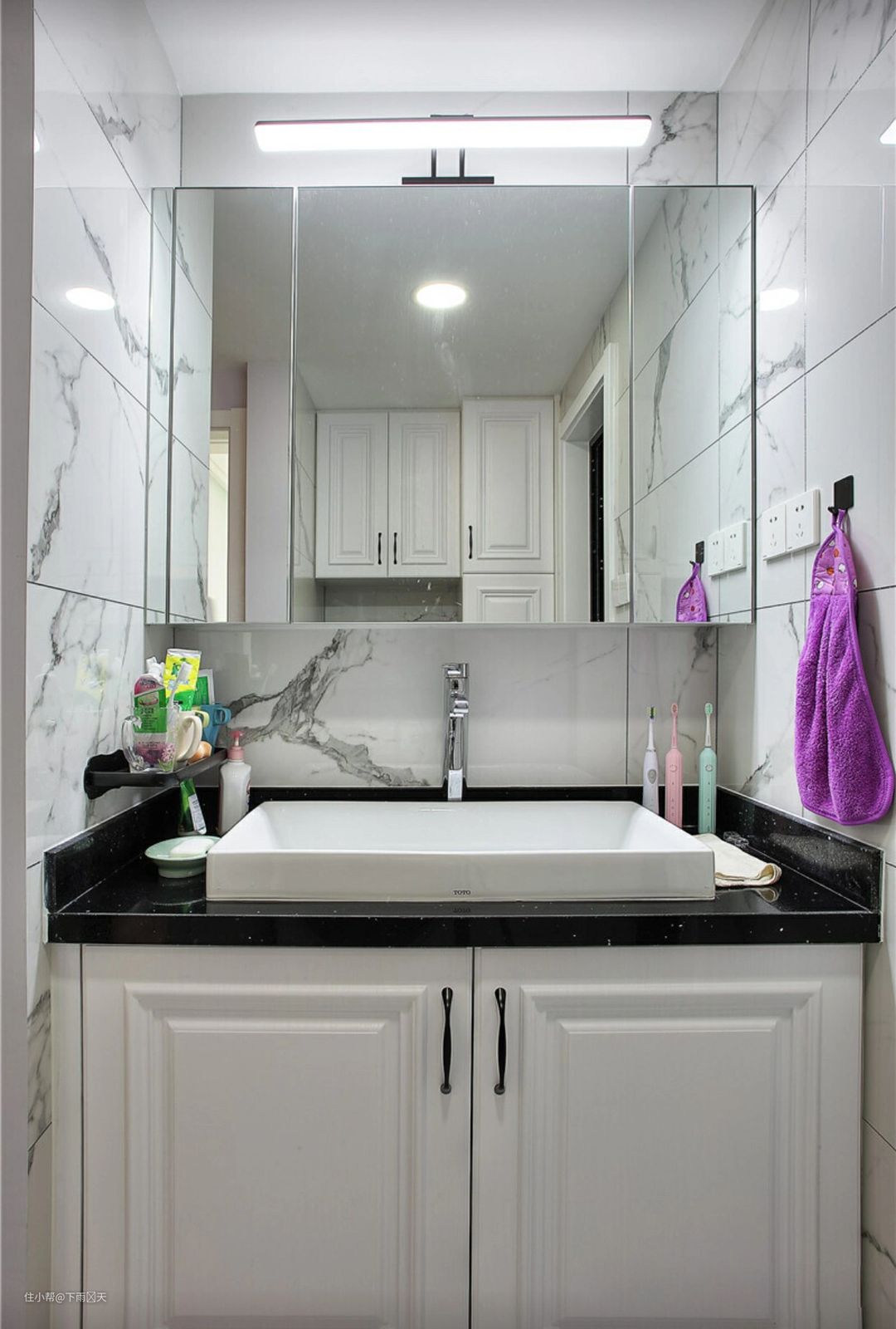 安装了颜值非常高的台上盆,不过稍微往上抬了一些,安装了柜式镜子,可以适当增加一些储物空间,觉得很实用。